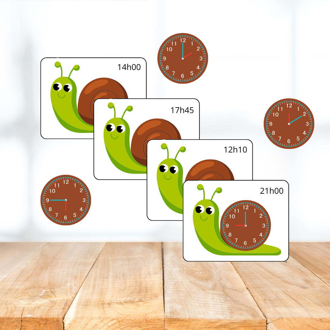 Le jeu comprend 18 cartes illustrées avec un adorable escargot, chacune indiquant une heure en haut à droite (ex : 9h30). L’enfant doit associer la bonne horloge à scratch avec la carte correspondante, ce qui lui permet d’apprendre à lire l’heure tout en s’amusant.