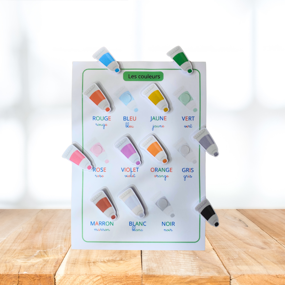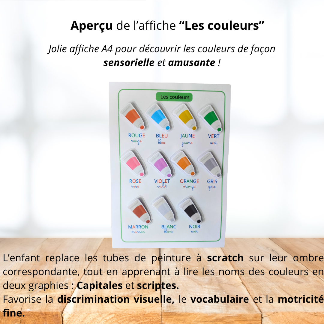 Une affiche A4 ludique et interactive pour apprendre les couleurs tout en développant la lecture et la reconnaissance visuelle.