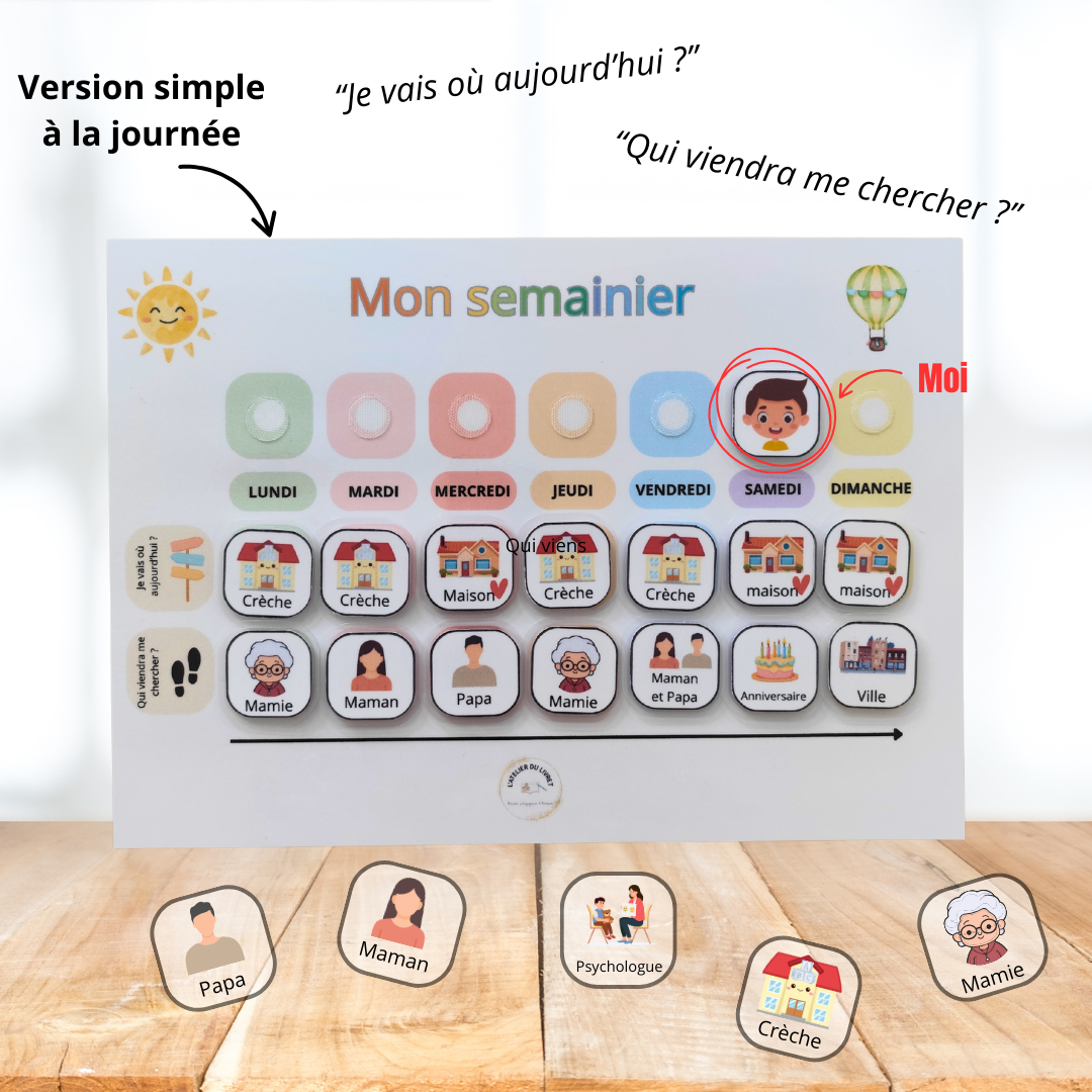 Aidez votre enfant à mieux comprendre et anticiper le déroulement de sa semaine grâce à ce semainier ludique et visuel.