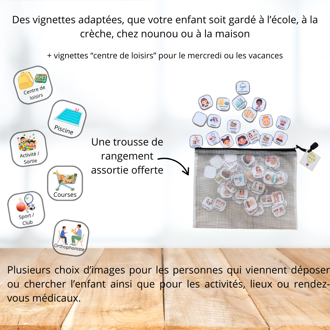 Semainier visuel et personnalisable pour aider l’enfant à organiser sa semaine : 3 modèles au choix, plus de 110 vignettes à scratch (lieux, activités, famille, rendez-vous…), plusieurs personnages ou photo personnelle, et une trousse assortie pour tout ranger.